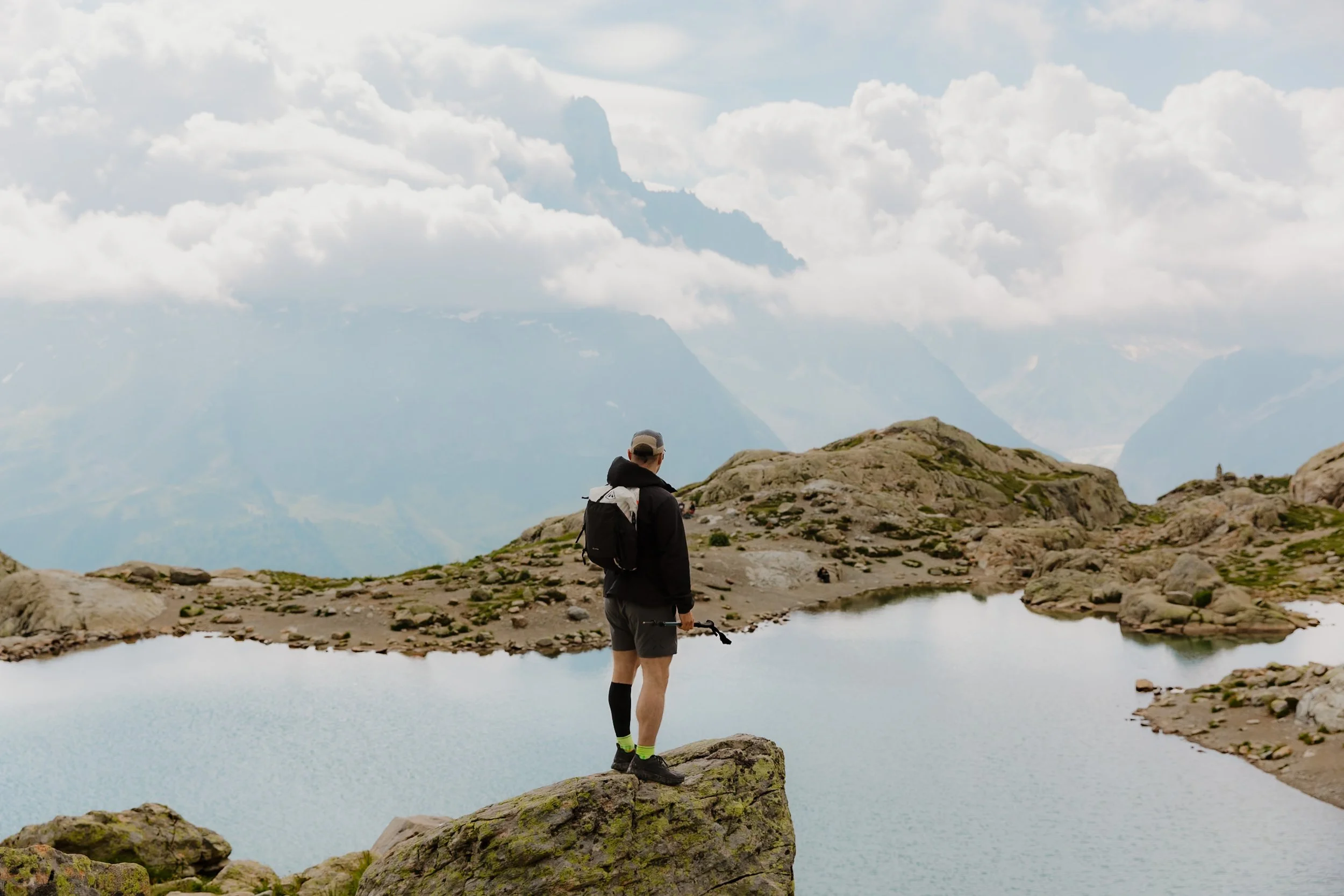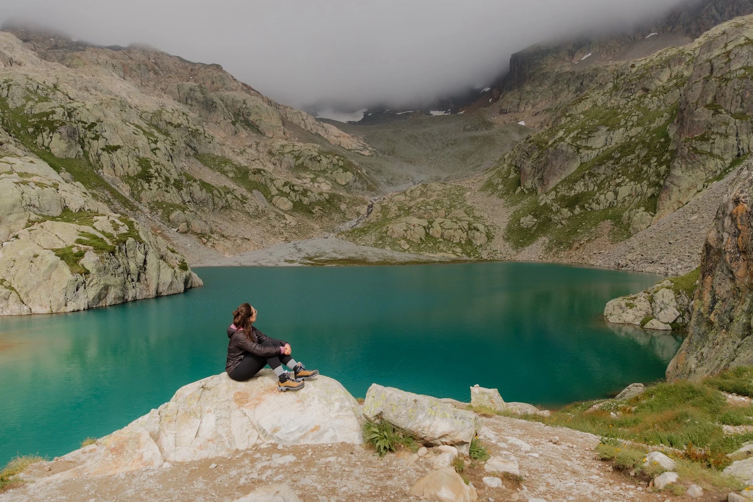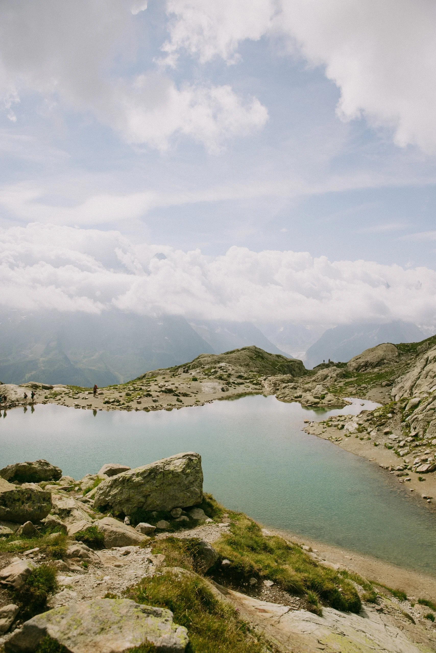 Lower basin at Lac Blanc, with clouds obstructing the view of the peaks