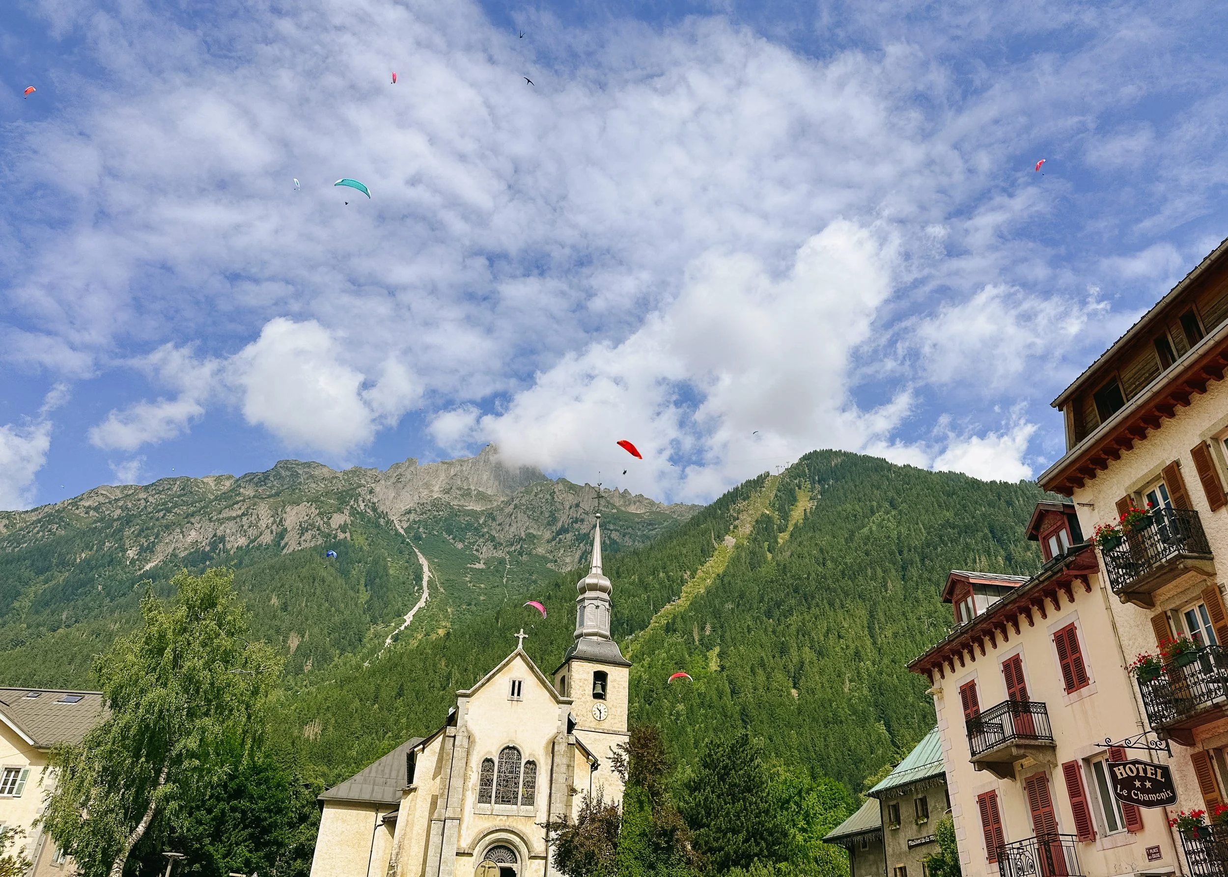 On any given day in Chamonix, look up and you'll see over a dozen colorful paragliders drifting above the valley between the peaks. It's one of those sights, out of many, that makes Chamonix feel properly cinematic. I genuinely couldn’t believe how many paragliders were dotting the sky above our heads at all times.